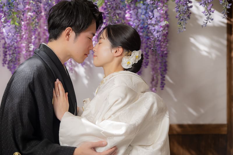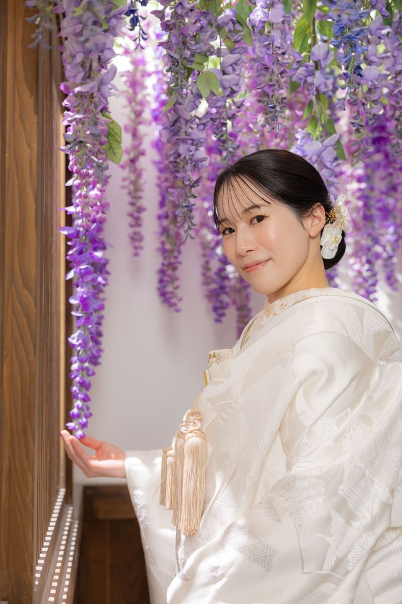 柔らかく垂れ下がる藤の花の色と、白無垢の純白。