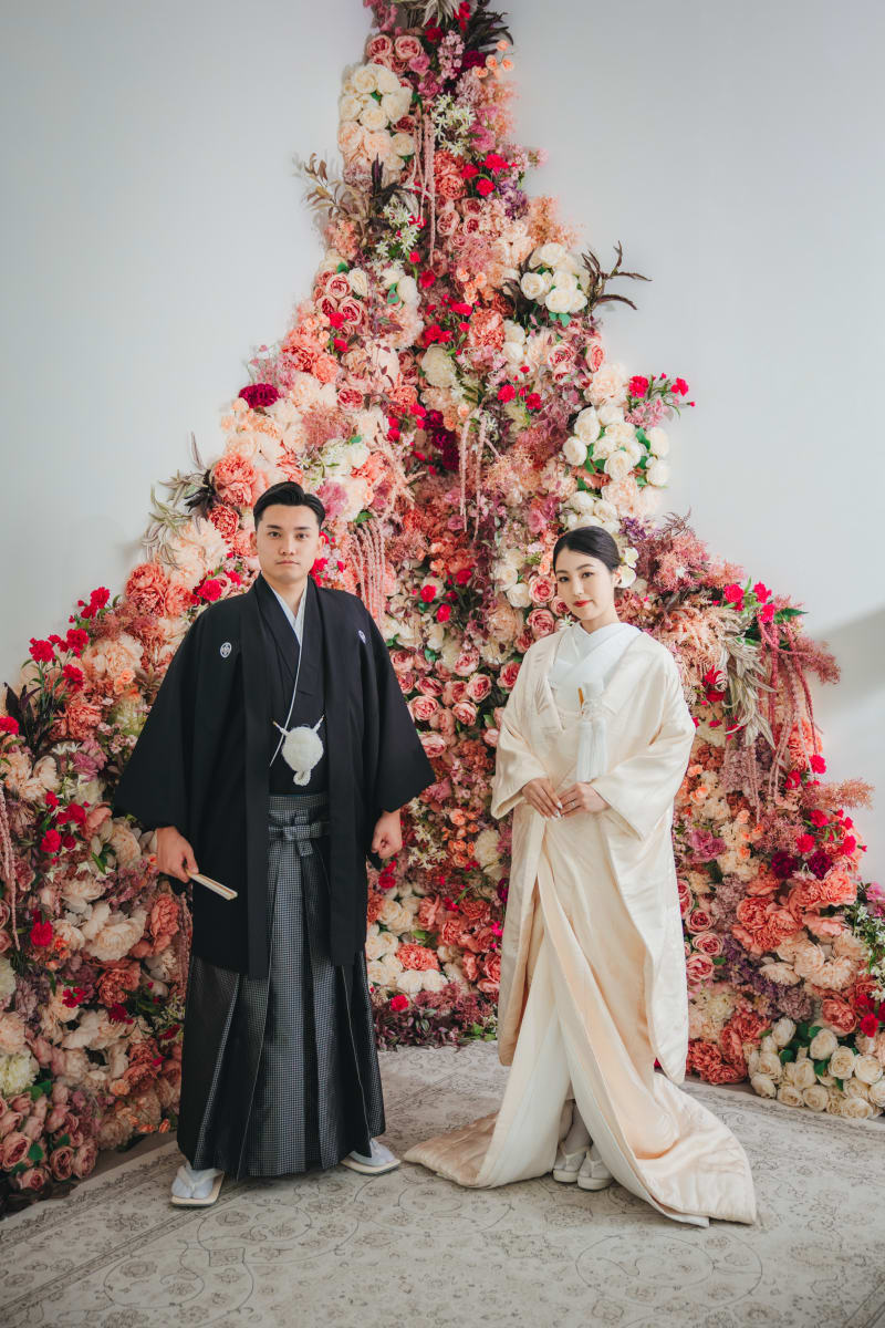壁一面にお花が飾ってあるため、ポーズはシンプルでも華やかな印象になります!