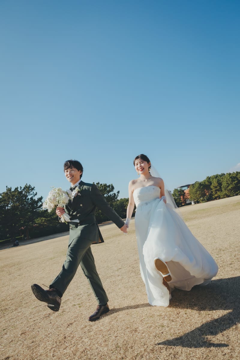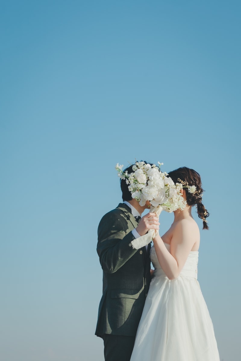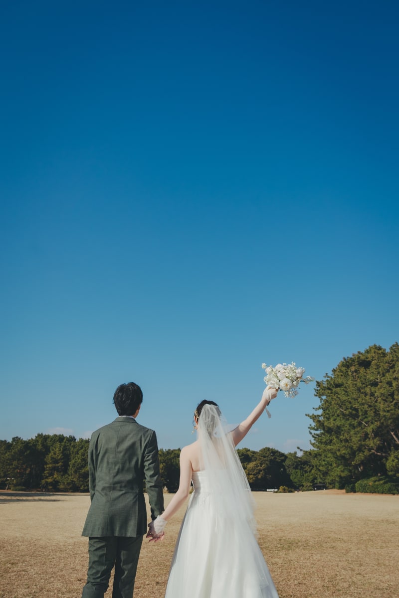 雲ひとつない晴天の青空と後ろ姿で!天に掲げた白いブーケが映えます!