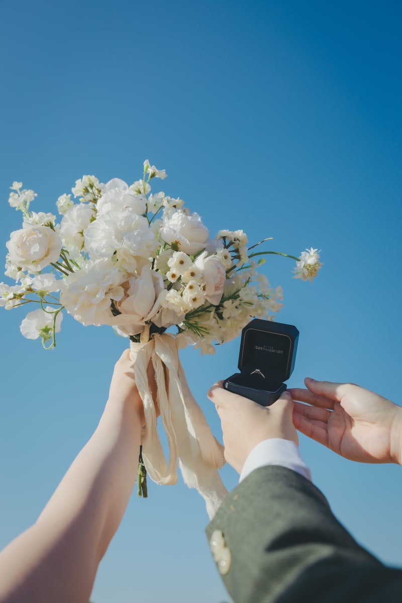 ブーケと指輪を青空バックで可愛く!綺麗な青空だからこそ!