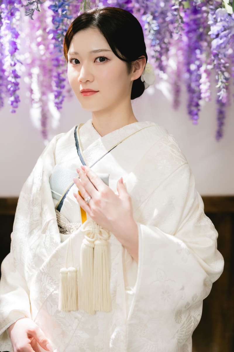ご新婦様のソロショットは藤のお花の下で。美しすぎるご新婦様ですね。