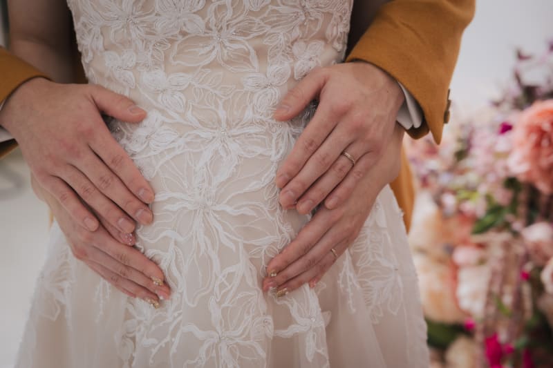 お腹に宿る新しい命にそっと手を触れて。手元のショットは皆さんに好まれます!