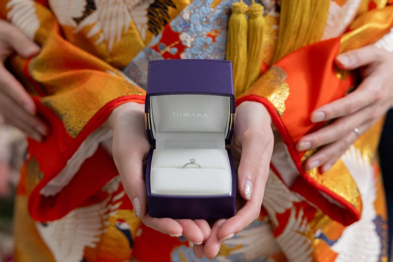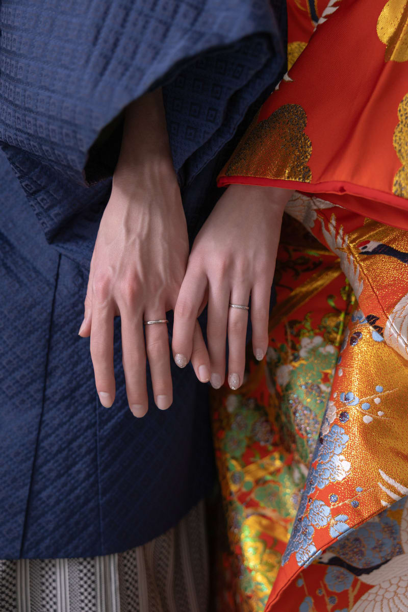 和装の衣装も少し映しながら指輪にフォーカスしたお写真です!二人だけのお揃いの指輪もしっかり残していけますよ◎