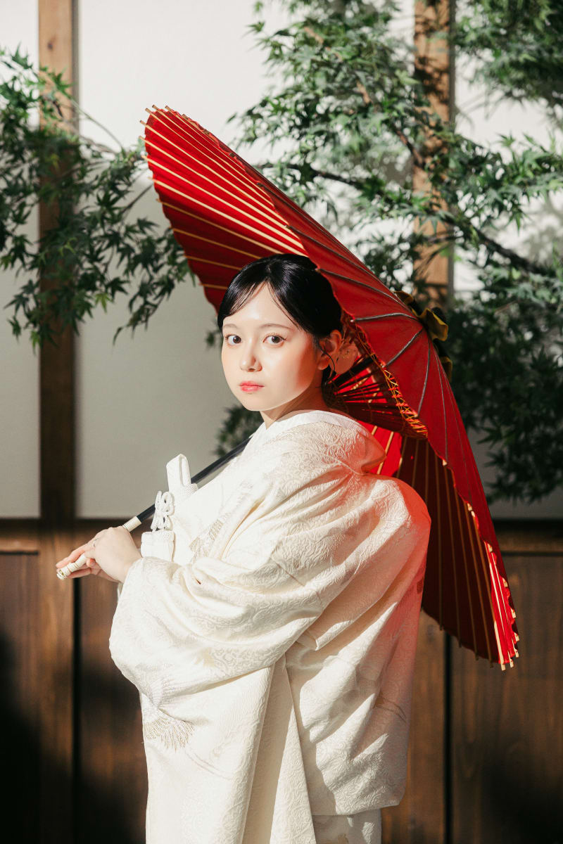 番傘を使って新婦さんのソロカットを撮影しました!傘は無料でレンタル可能です!