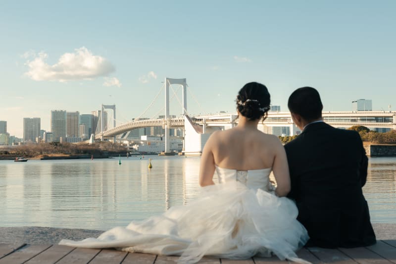 お台場海浜公園といえば!レインボーブリッジですよね!! おふたりが景色を眺めている様子のお写真です^^