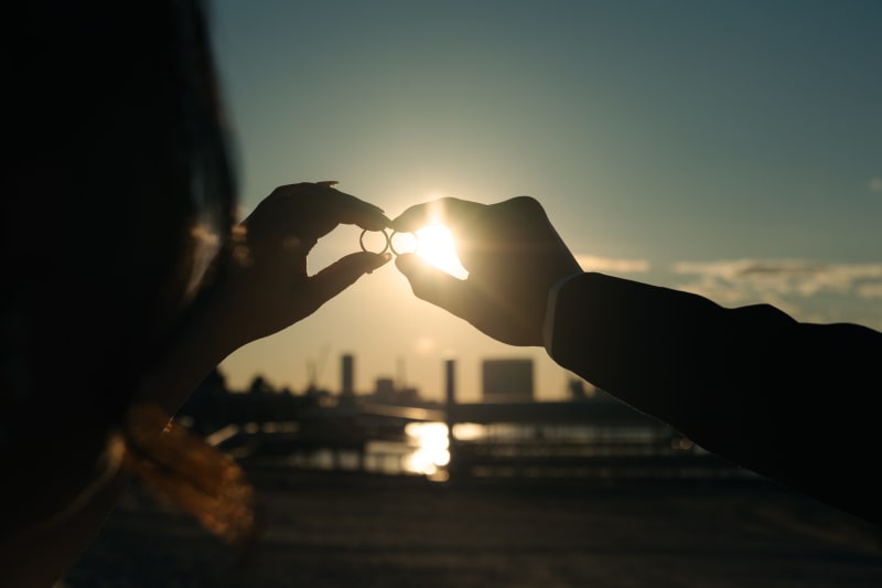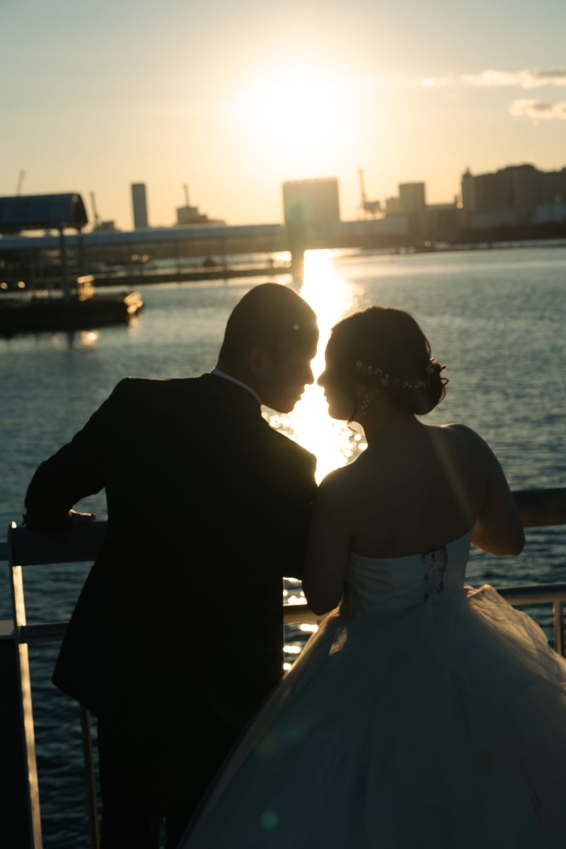 夕日の綺麗な反射と一緒におふたりの撮影を結びました!