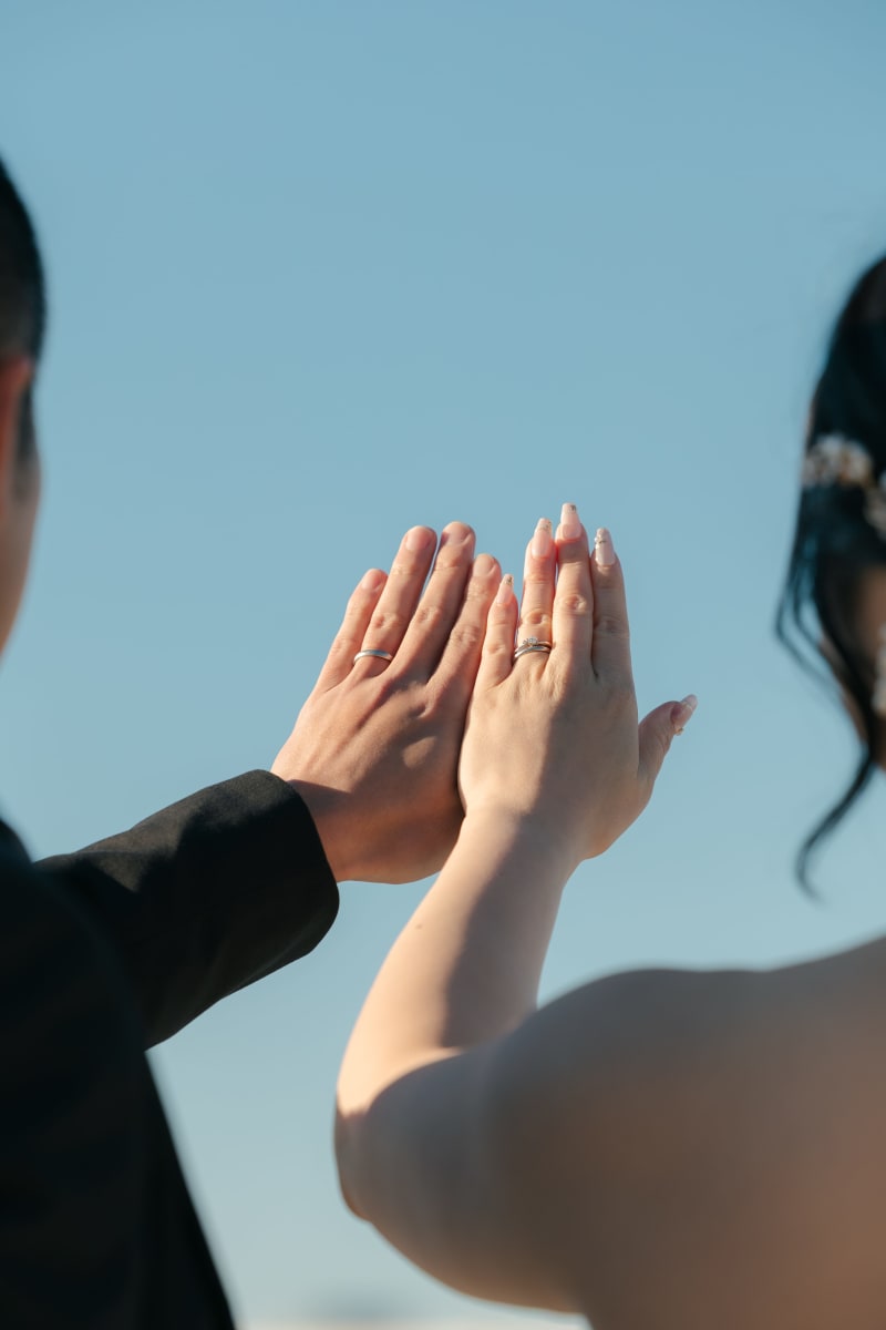 雲ひとつない青空に手を伸ばしてもらって、指輪をしっかり見せてもって!