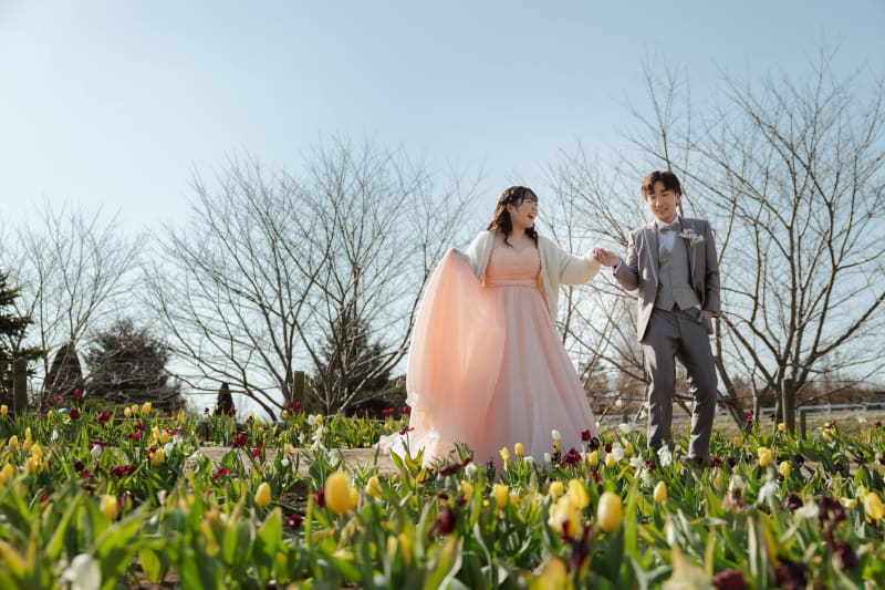 チューリップ畑と一緒に!手を繋いで楽しそうな雰囲気がまた可愛いです!