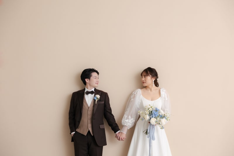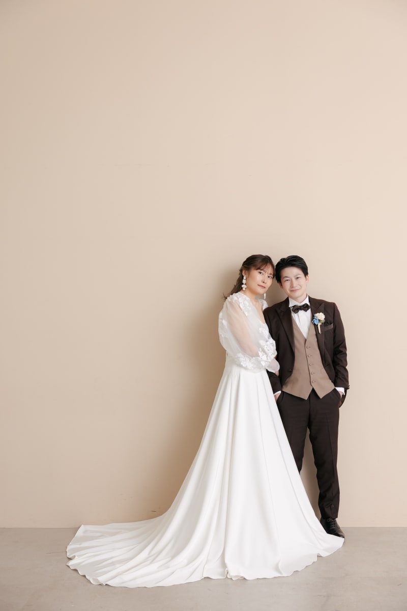 無地ですが、柔らかいお色味のベージュの背景、タキシードのお色味に合っていて素敵です!