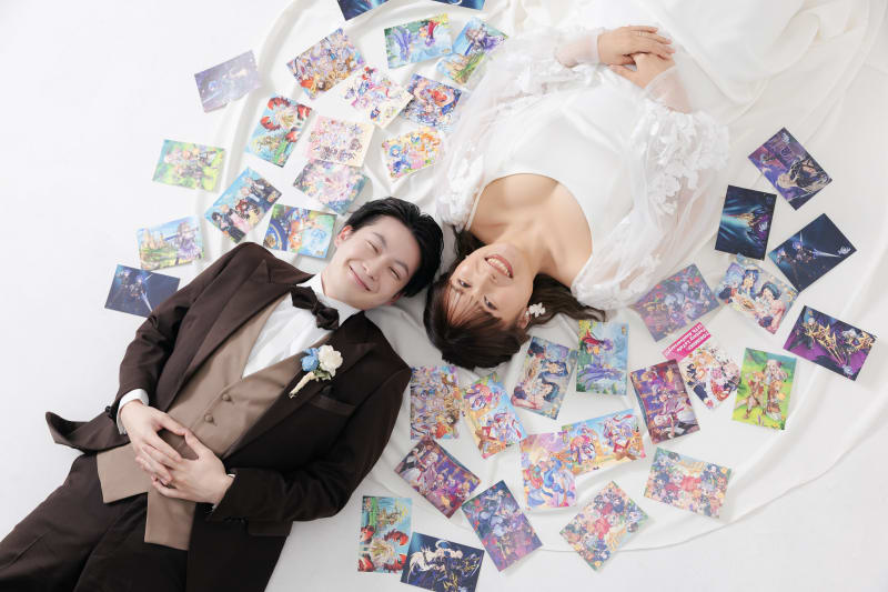 おふたりの共通の好きなもの、ゲームのポストカードをたくさんお持ちいただきました! 囲まれてみるのもかわいいです!