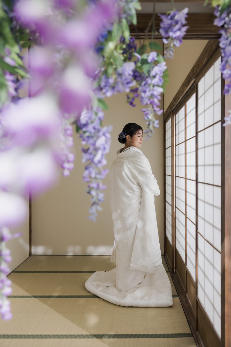 和装は婚礼写真ならではの白無垢で神父様の個性を取り入れたブルーの小物へ