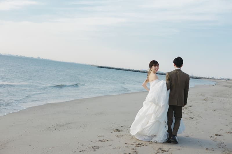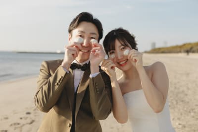 砂浜に散らばっている可愛い貝殻を使って撮影したり、イメージショットを撮影したり、、お二人だけではなく色々な方向から写真を撮影していきます◎