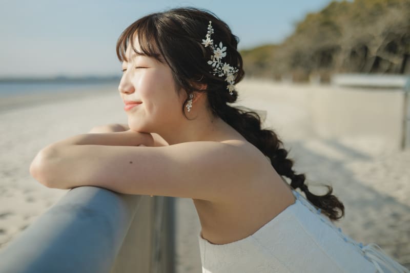 風と太陽を感じて気持ちよさそうな新婦様。撮影では新郎新婦様それぞれのソロショットも撮影していきます♩