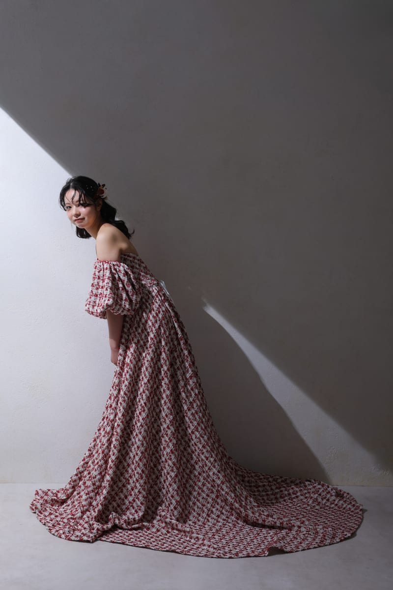 上品なツイード素材に、落ち着いたレッドカラーが印象的なこちらのドレス。