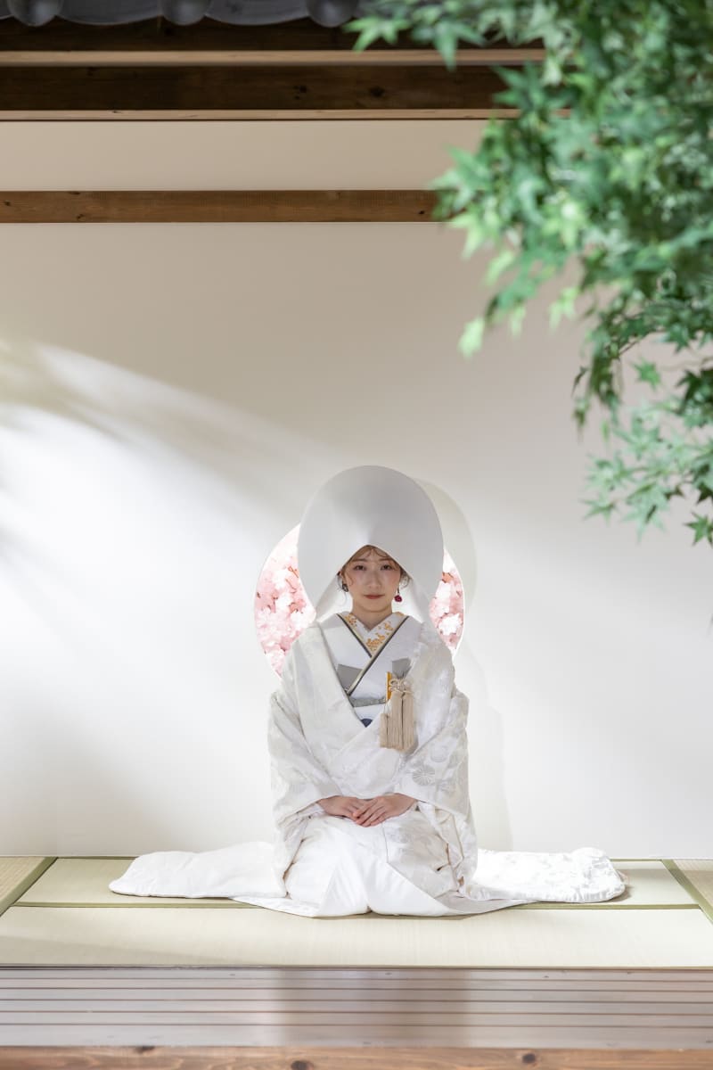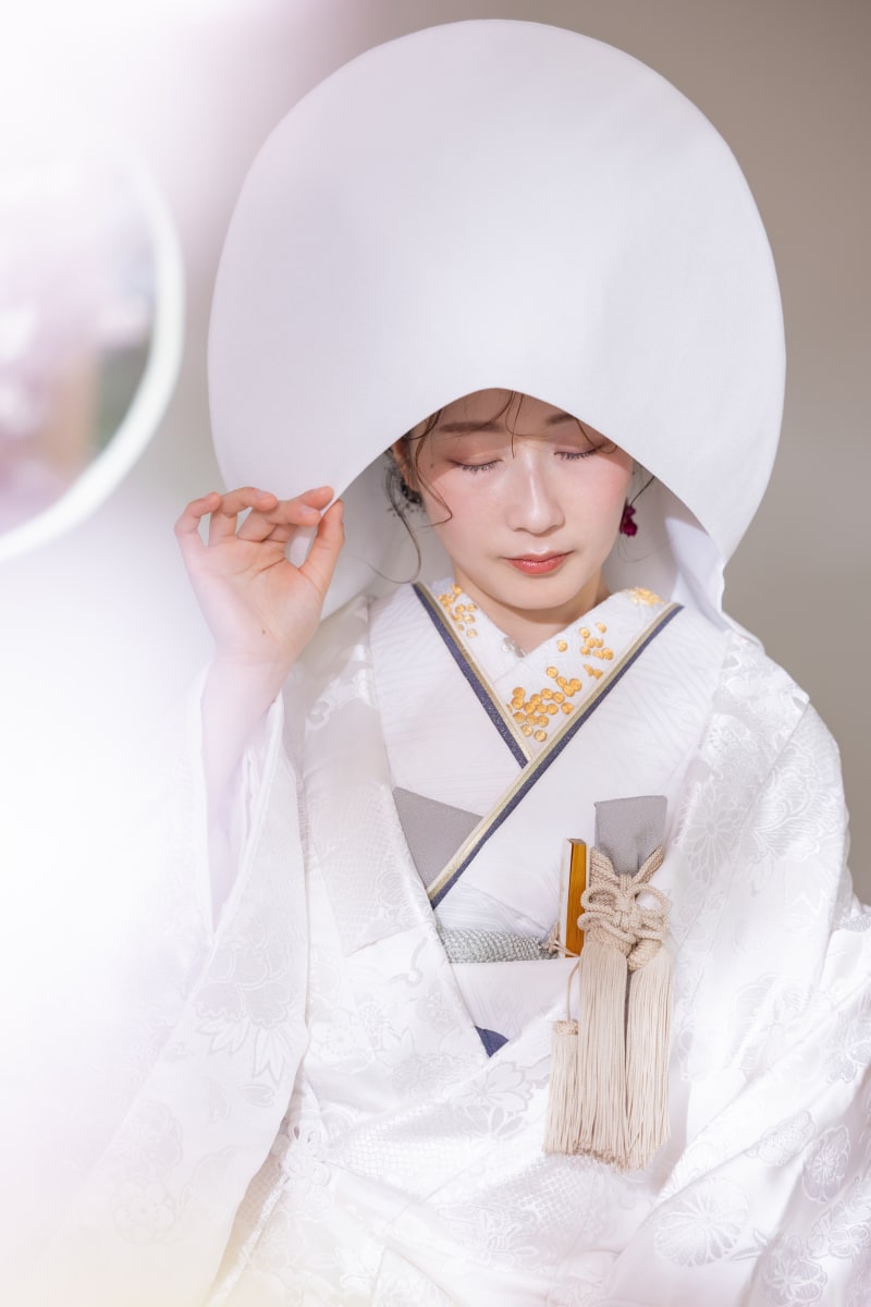 白無垢に綿帽子を合わせた姿は、まさに王道の花嫁スタイル。