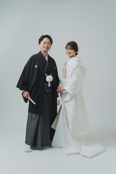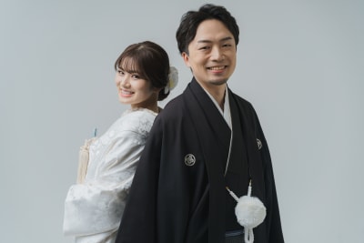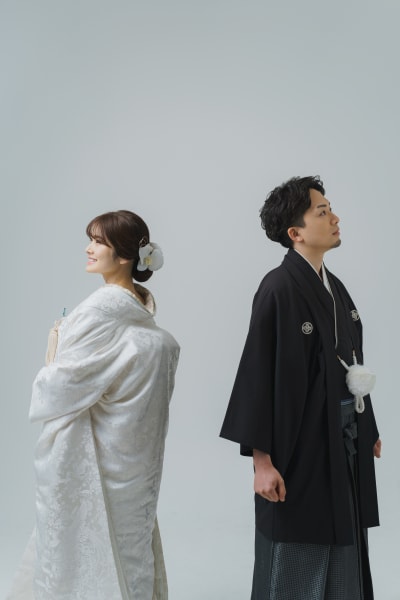 背景がシンプルだからこそ、お二人の表情や衣装の美しさが際立つ一枚に仕上がりますね。