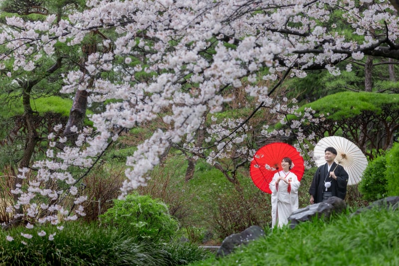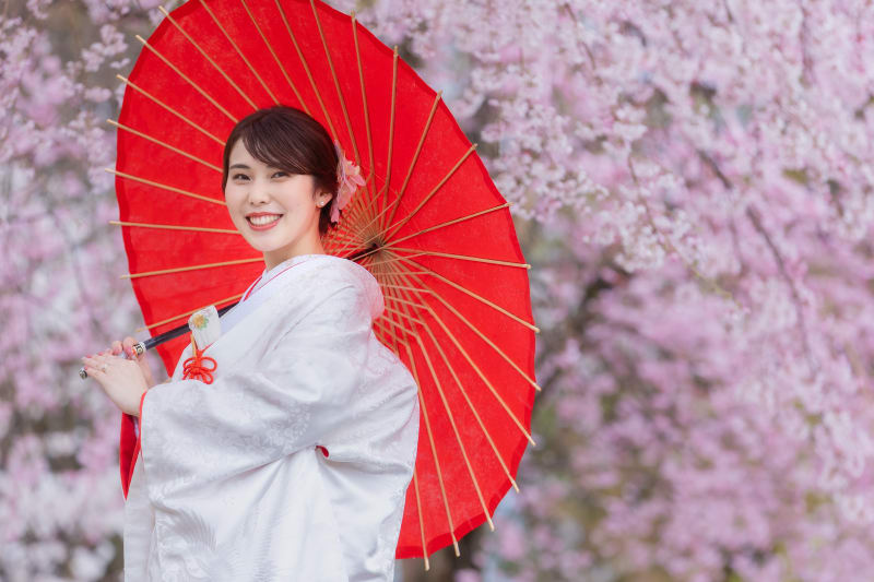 満開の桜の下、シンプルな和装が映えていてとても綺麗ですよね☺︎