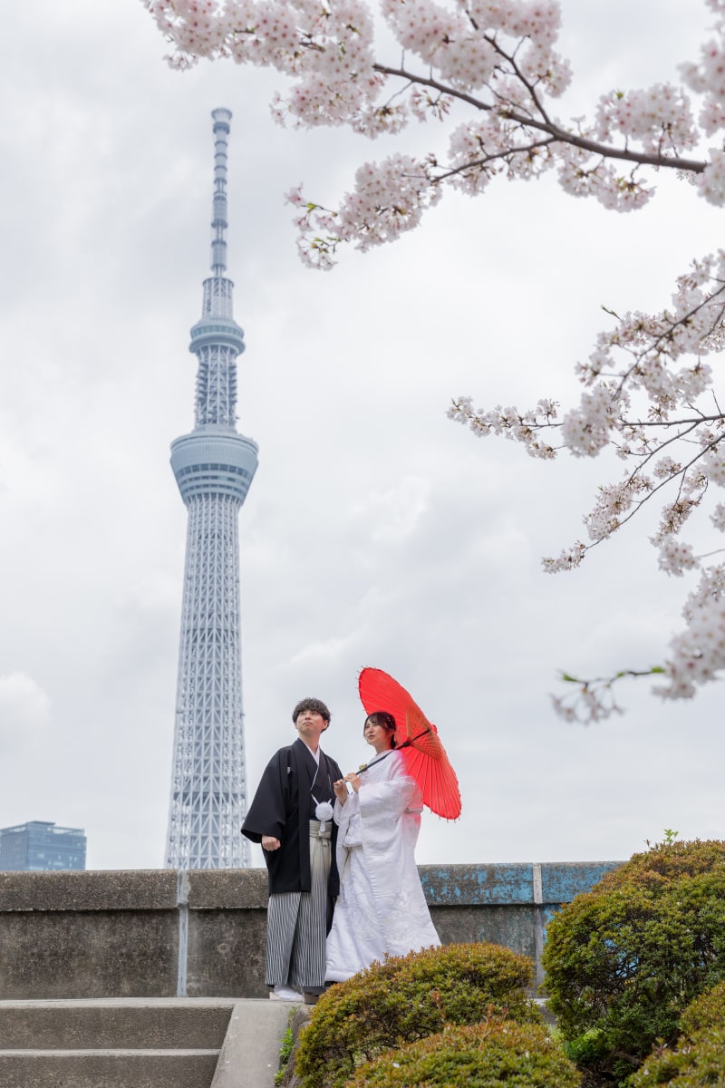 スカイツリーとのスリーショットです!桜とのコラボレーションもいい感じ!