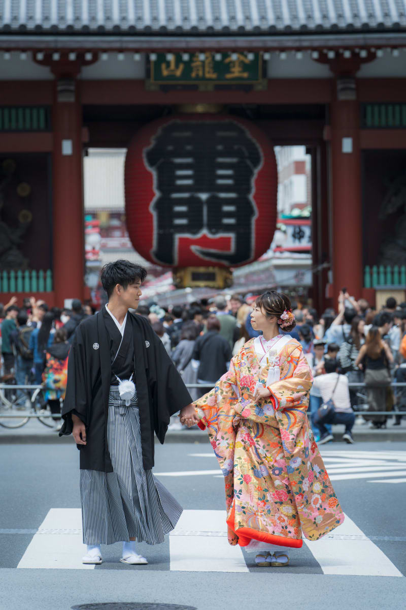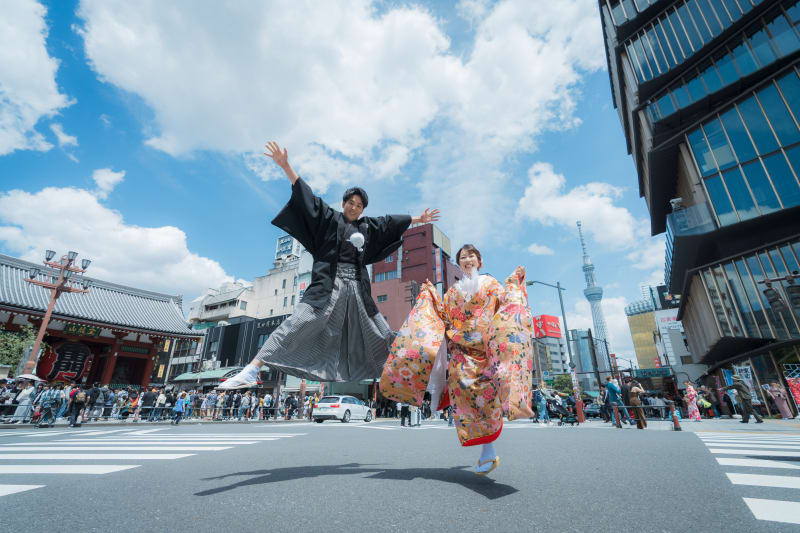 浅草の雷門前にてロケーション撮影!お二人の元気と仲の良さが溢れ出るお写真に仕上がりました!