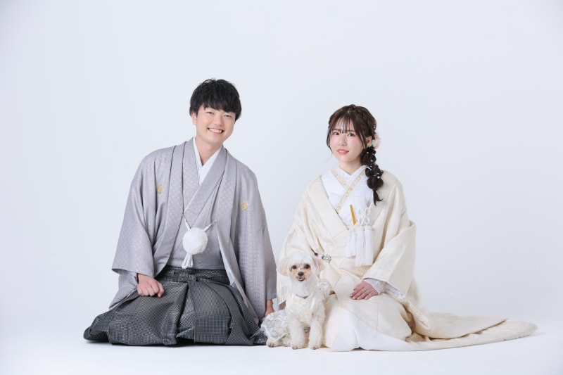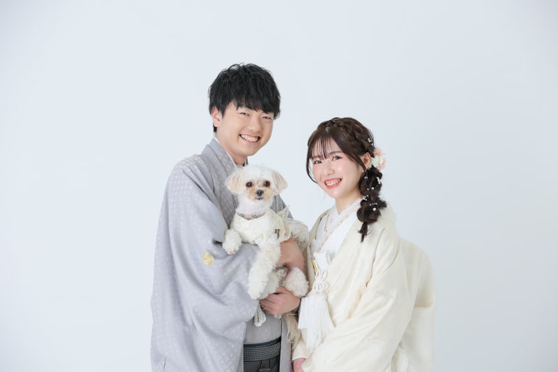 お二人の笑顔と可愛いワンちゃんがシンプルな空間に彩りを添えています。