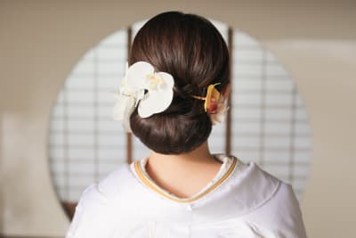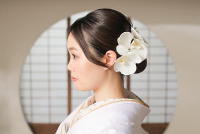 艶感のあるまとめ髪に、左右色違いの蘭をあしらっています