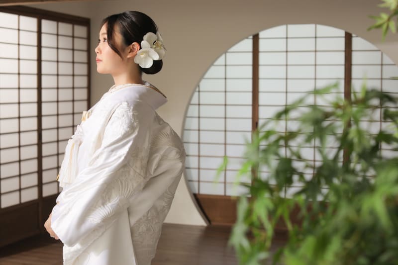 本日はつるんとしたタイトなヘアに胡蝶蘭をあしらって、上品に可愛く白無垢を着こなしていただいた新婦様のご紹介です。