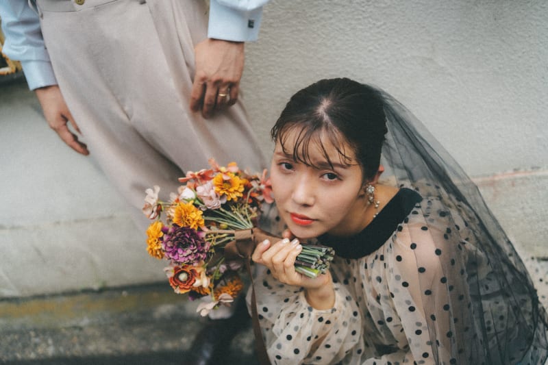 カラードレスは黒のドットで透け感のあるデザインをチョイス。