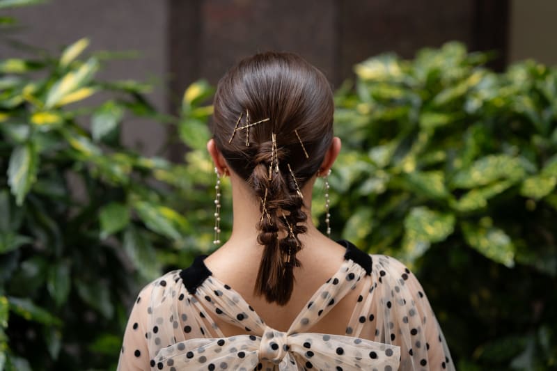 前髪はパーマ風にアイロンを通して動きを出し、後ろは2束に分けて編み込みしたりネジネジしたり。