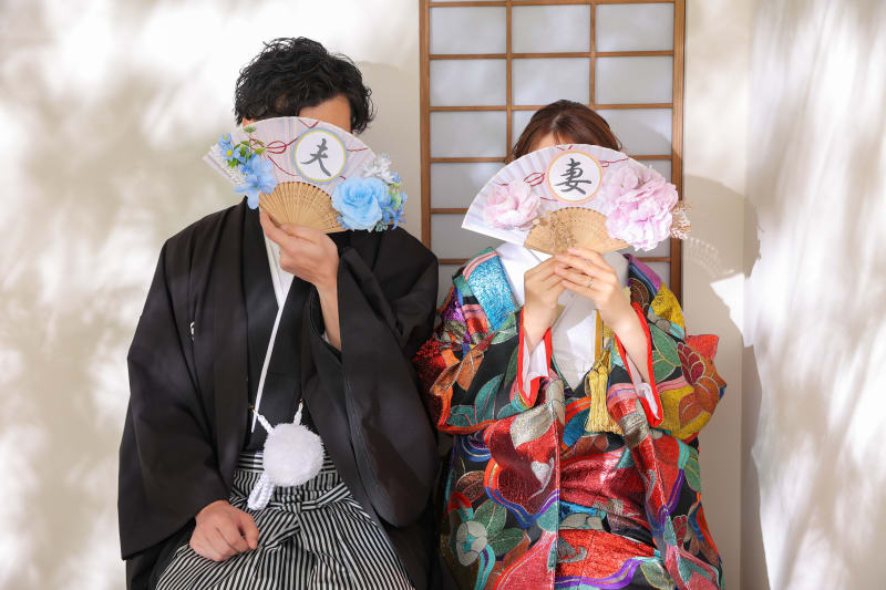 本日は和装・屋内庭園スタジオ撮影に、かわいらしい扇子をお持ち込みいただいたお二人のご紹介です。