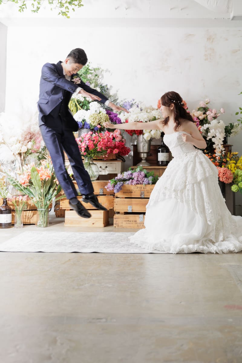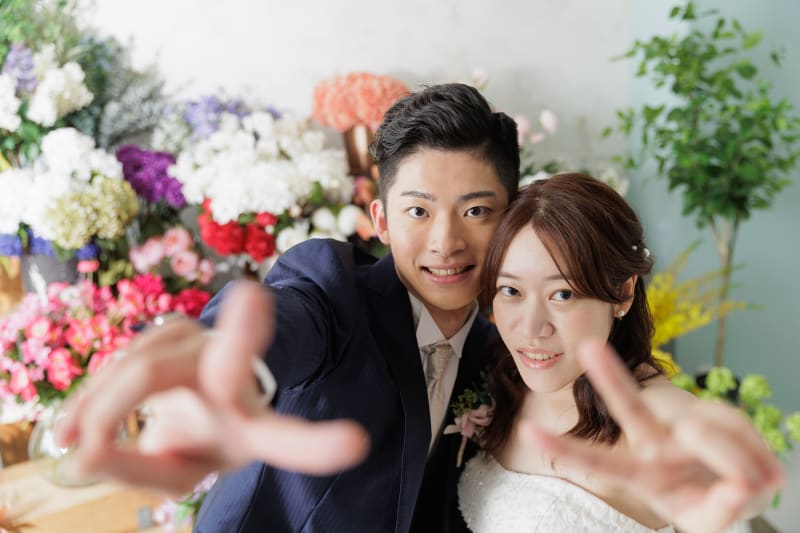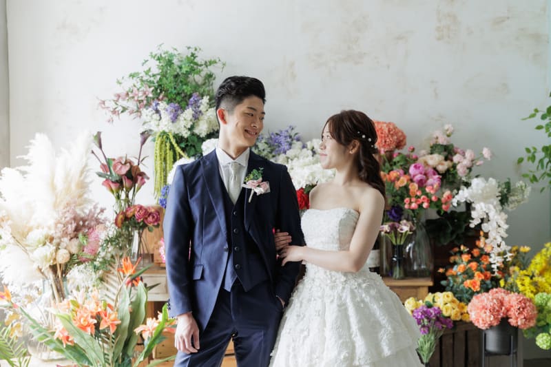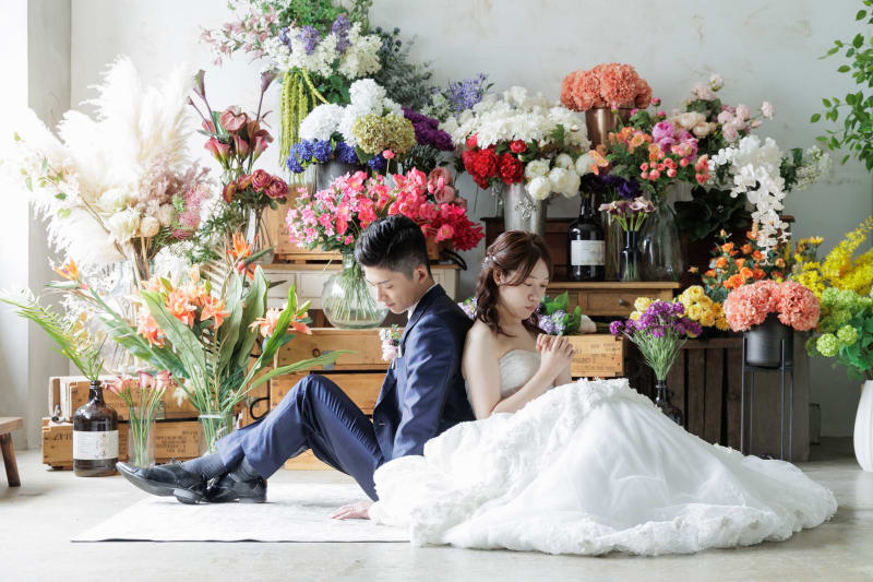 今回は華やかなお花に囲まれたお二人の写真をご紹介!
