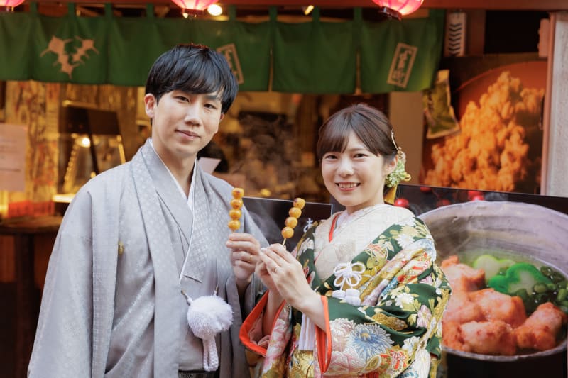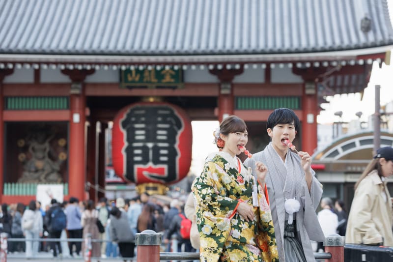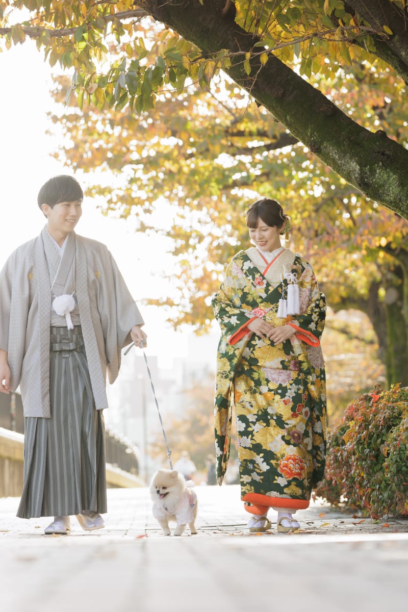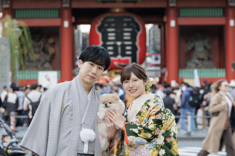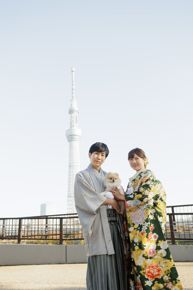本日はわんちゃんと一緒に浅草の街並みで撮影させていただいたお二人のお写真のご紹介です!