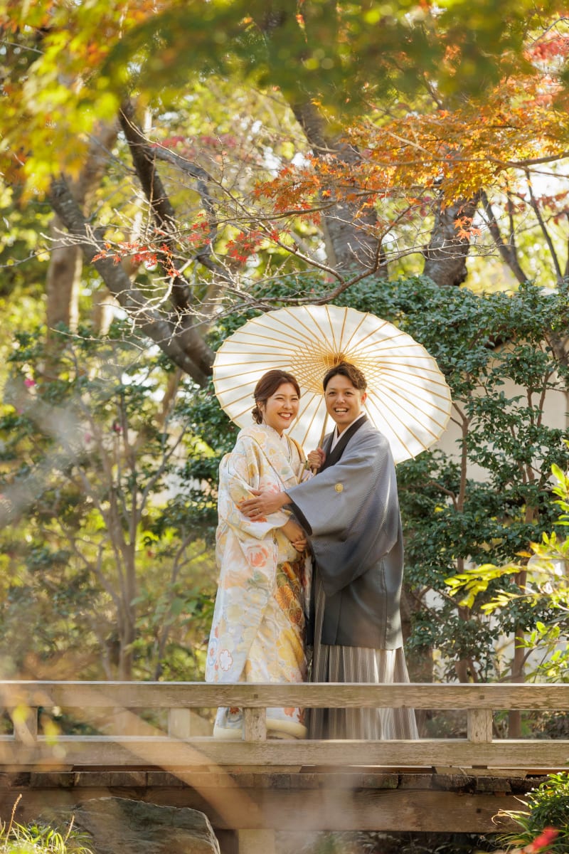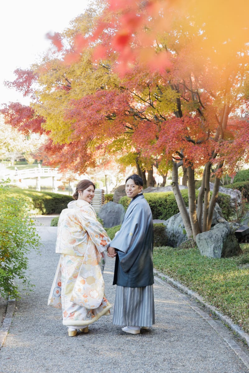 色とりどりの木々が二人をお迎えしているような苑内で、手を繋いで歩いたり。