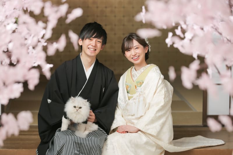 3〜4月は桜が咲いている中でのロケーション撮影が人気ですが、屋内庭園スタジオでも桜の造花を使用して、このようなお写真を撮影することができます🌸