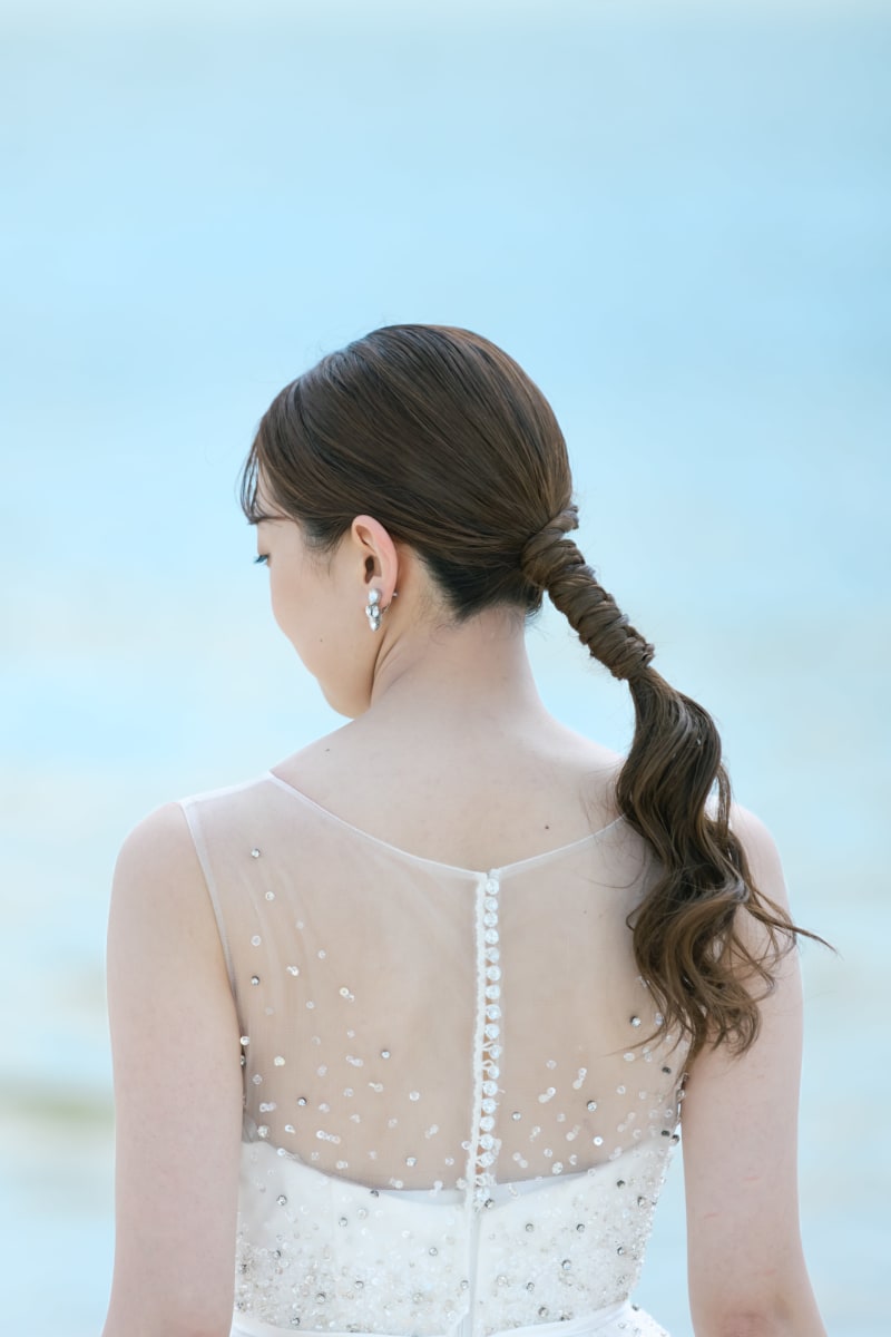 ドレスのバストアップのデザインが、ビジューなどついている為ヘアはシンプルなままにしました。