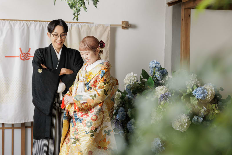 紫陽花や緑を入れて自然なお二人を撮影させていただきました。