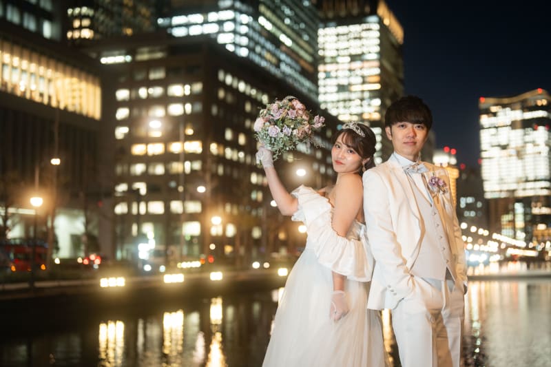 東京駅の前では、素敵なライトアップを元にロマンチックな撮影が、、!