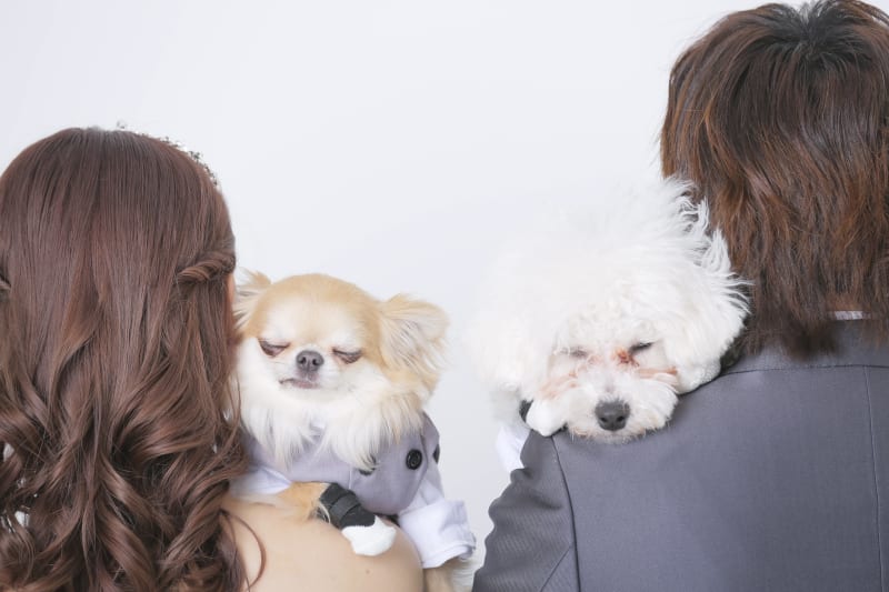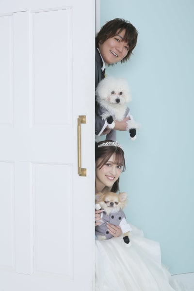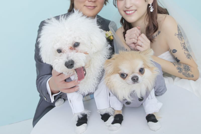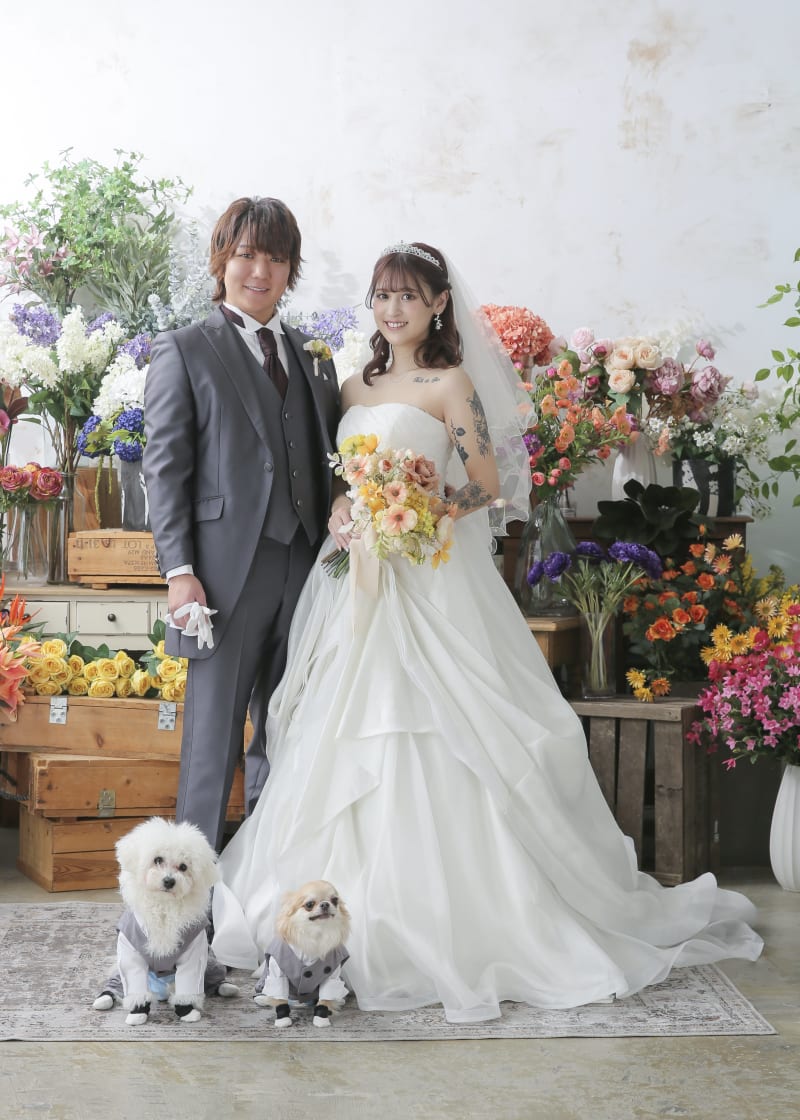 こんにちは!スタジオAQUA浅草店カメラマンのインです。本日はおしゃれなお二人と可愛いワンちゃんたちのハッピーな撮影をご紹介いたします。おりこうさんのワンちゃんで、癒された1日でした。末長くお幸せに☺︎