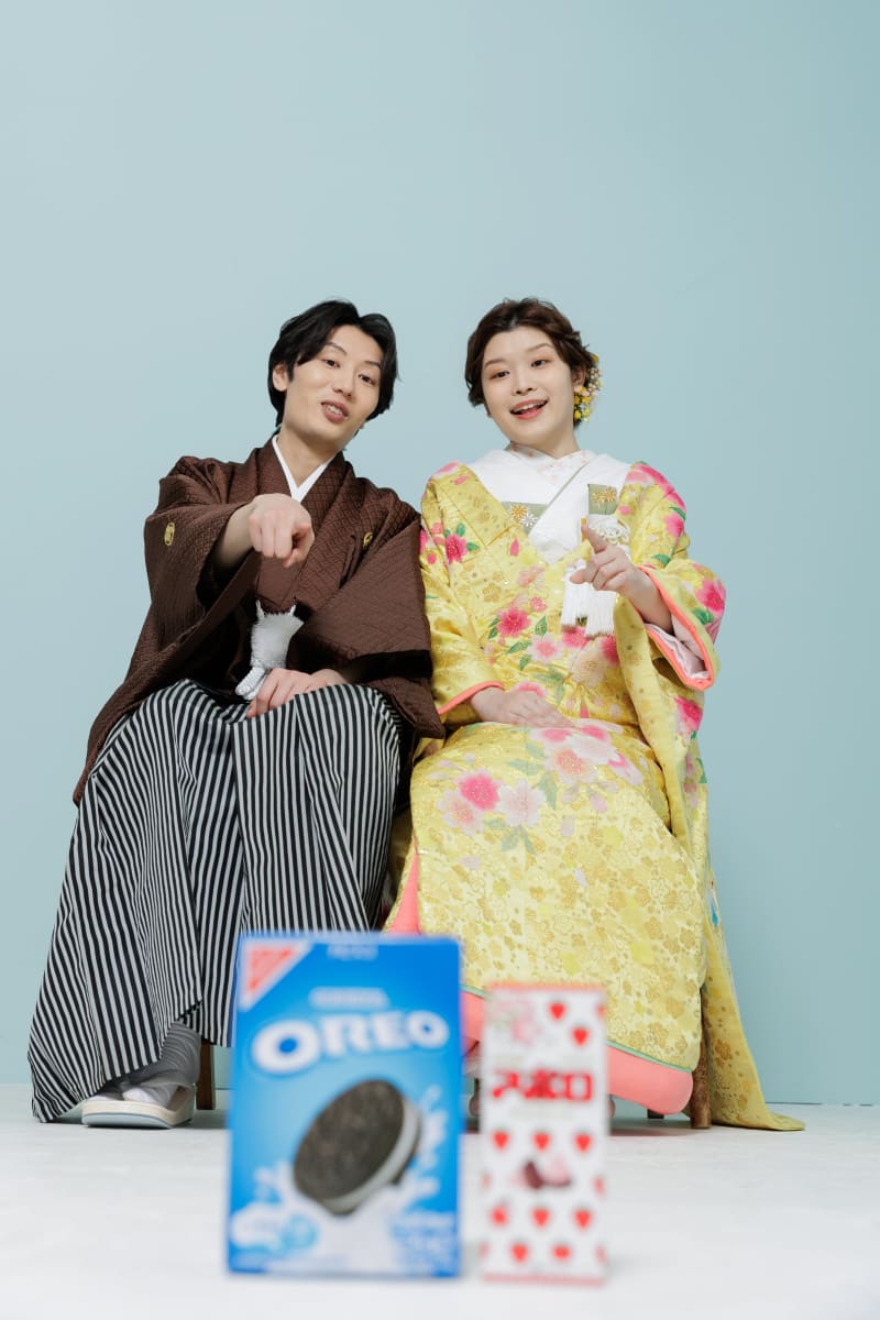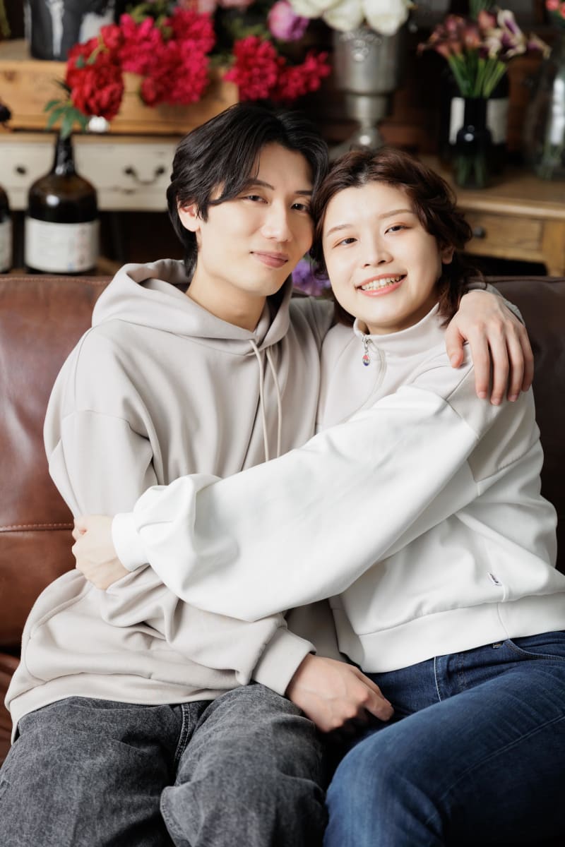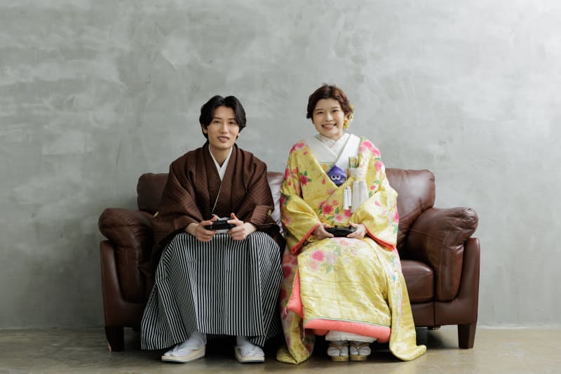 ゲーム内に出てくるキャラクターのぬいぐるみを衣装に挟んで、お二人でおうちでゲームしているみたいなイメージで撮影させていただきました。