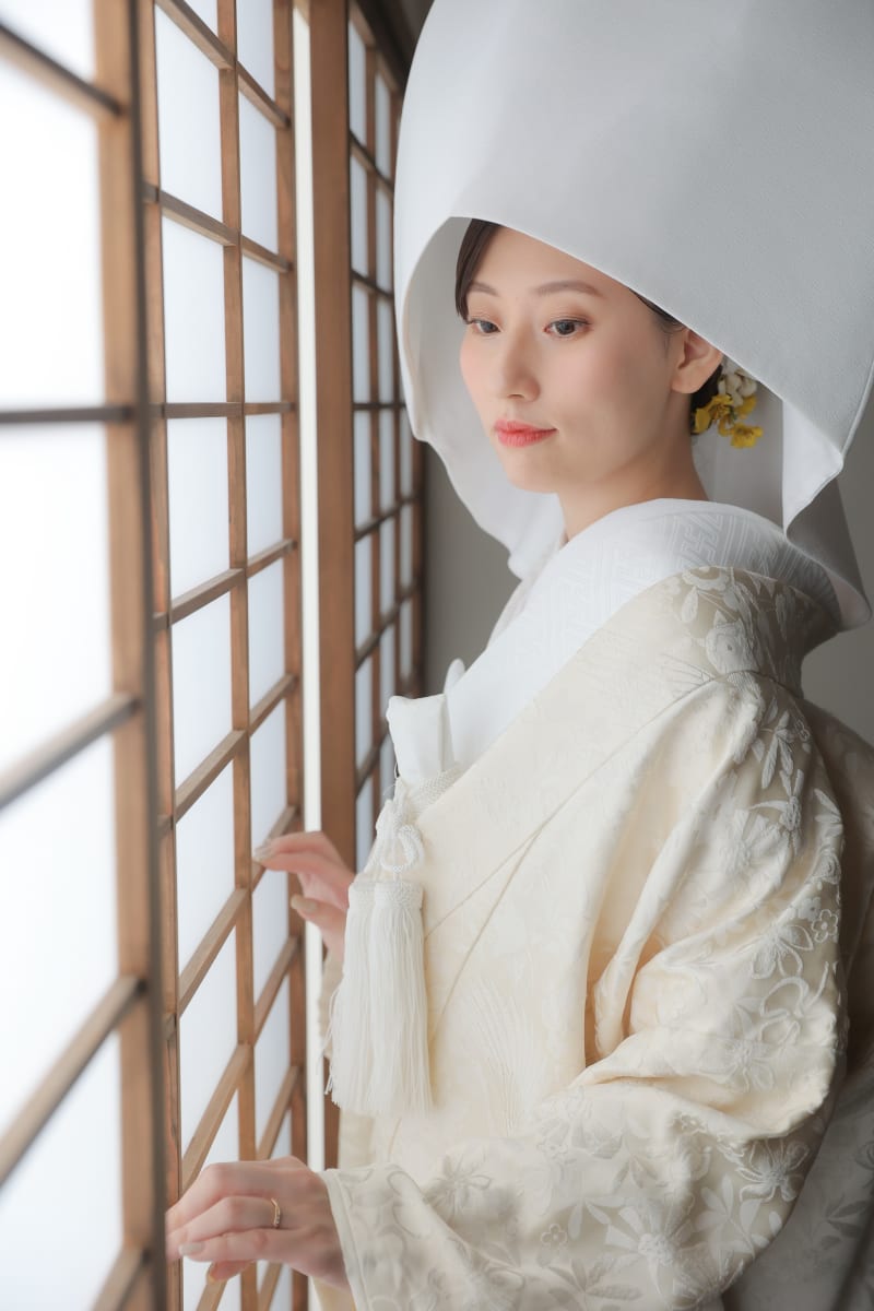 和装では今ご要望が増えている、綿帽子を着用いただきました!綿帽子をつけていても髪飾りを見せるため少し下めにつけ、メイクはしっとりとした雰囲気にするためオレンジブラウンメイクに!