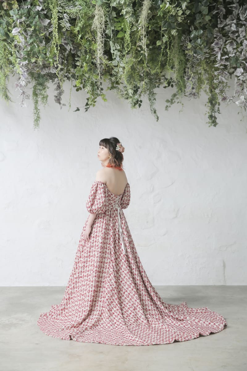 - 珍しいピンクのチェック柄のカラードレスです! ポイントは袖の形です。 袖が流行りのパフスリーブとなっておりボリュームがあってとても可愛らしい 雰囲気のお衣装です!
