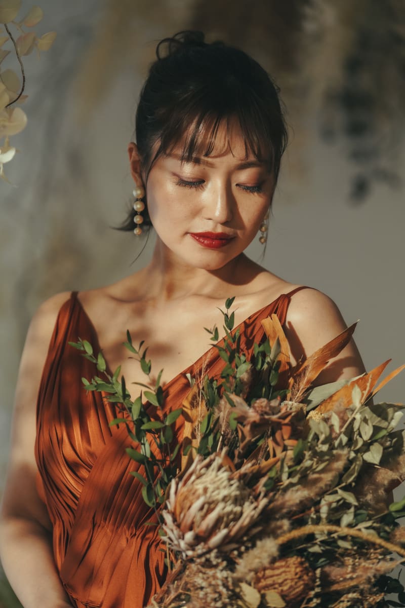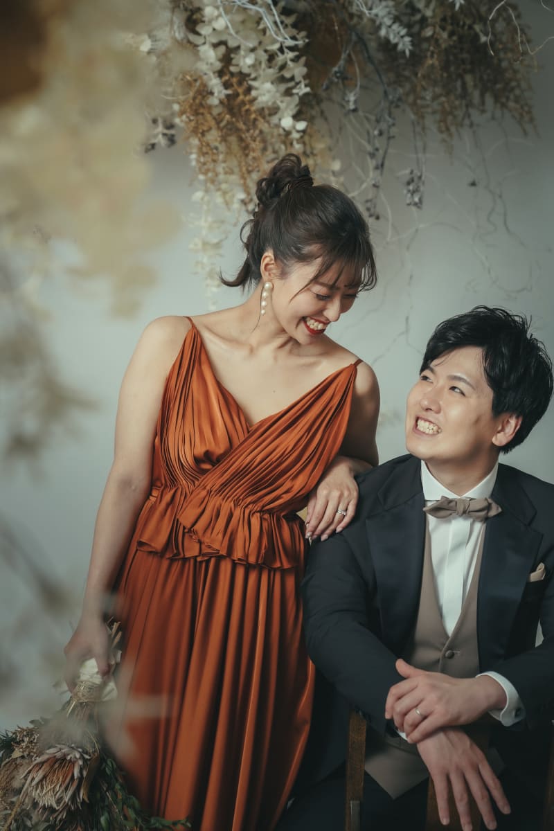 新作のカラードレスmêmeのブラウンのドレスは、ナチュラルな雰囲気のチャペルスタジオにとてもよく映えます☆