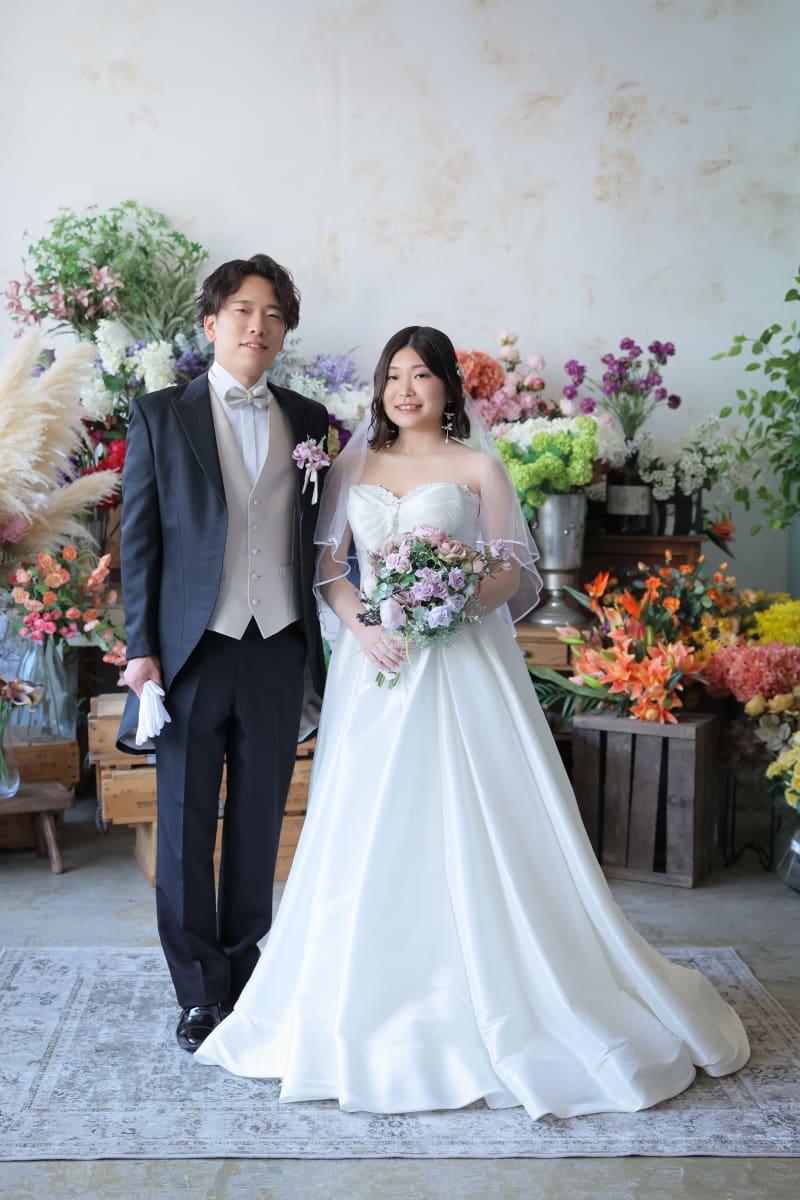お花に囲まれた背景を含むハウススタジオでの洋装をご紹介します!