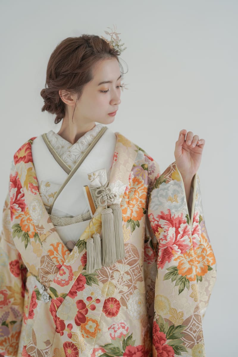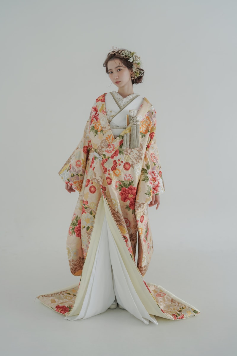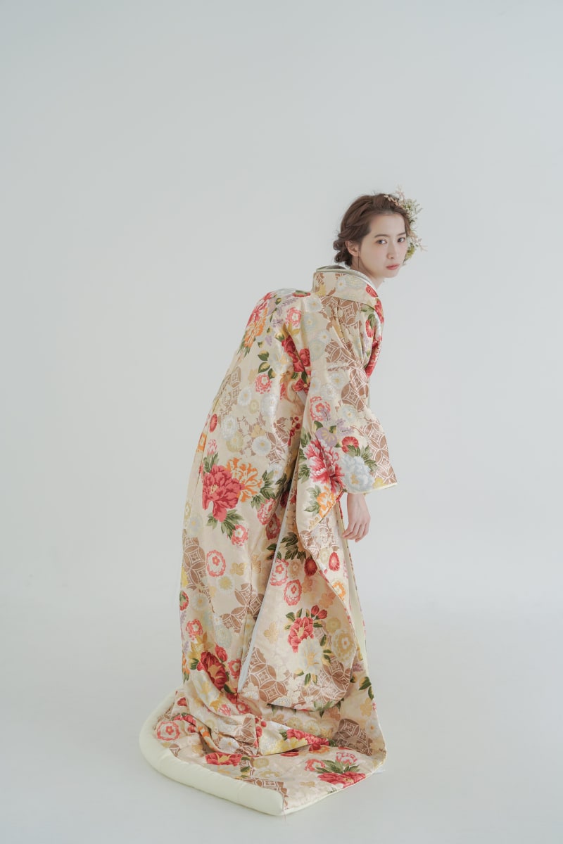 こちらのお着物は円形が途切れることなく永遠に展開する図形から円満やご縁の吉祥として喜ばれてきた七宝文様と富貴の象徴として評されている牡丹、丸く可愛らしい菊の花を描かれており、地紋に浮き上がる葉がモダンな印象の色打掛です。