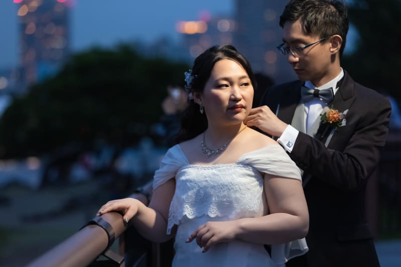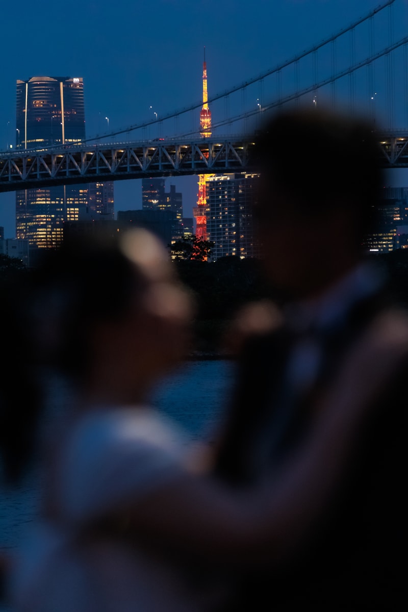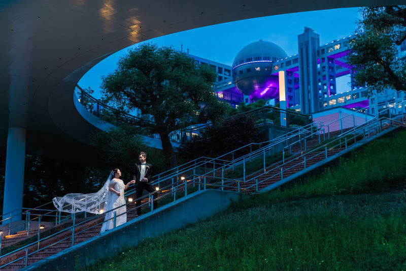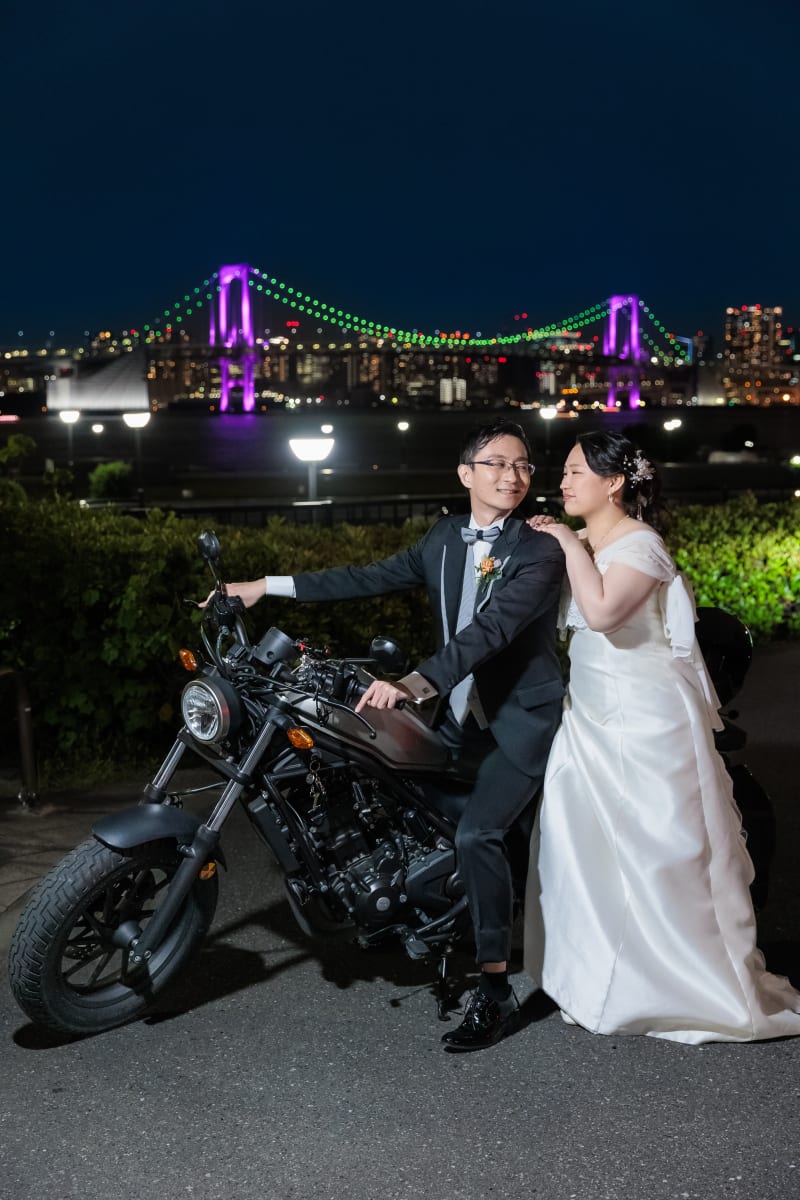 スタジオアクア浅草店でございます。今回は屋内庭園スタジオとお台場海浜公園ロケーションで撮影されたお二人のご紹介です。新郎様がお気に入りのバイクと一緒に撮りたい!その願いを夜のお台場海浜公園で叶えることができました。ぜひご覧ください。