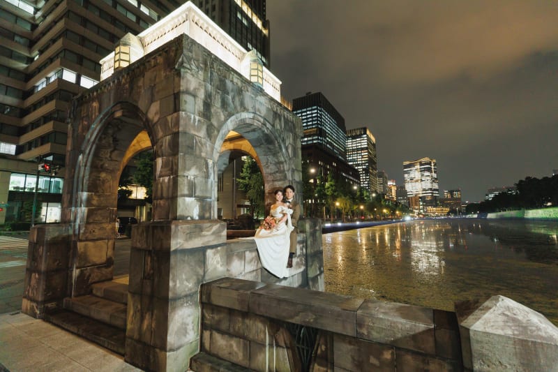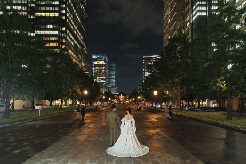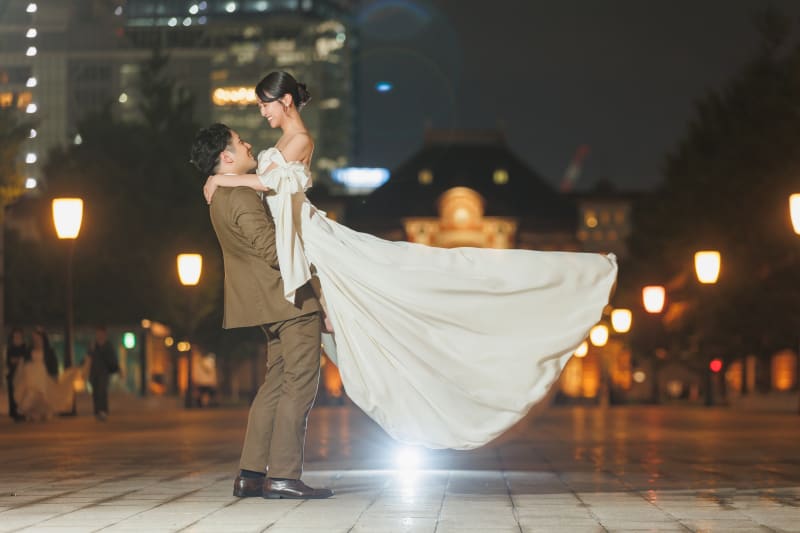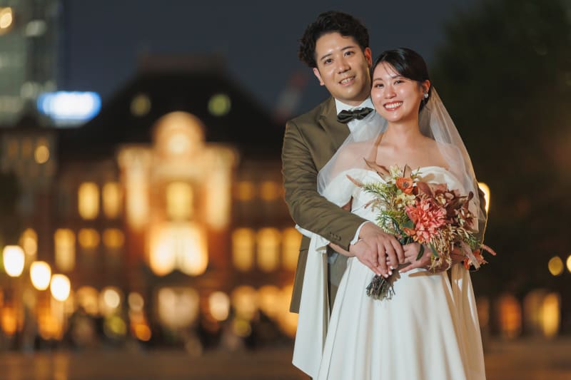 東京駅を背景にバックハグ!