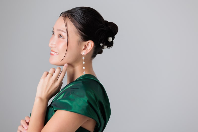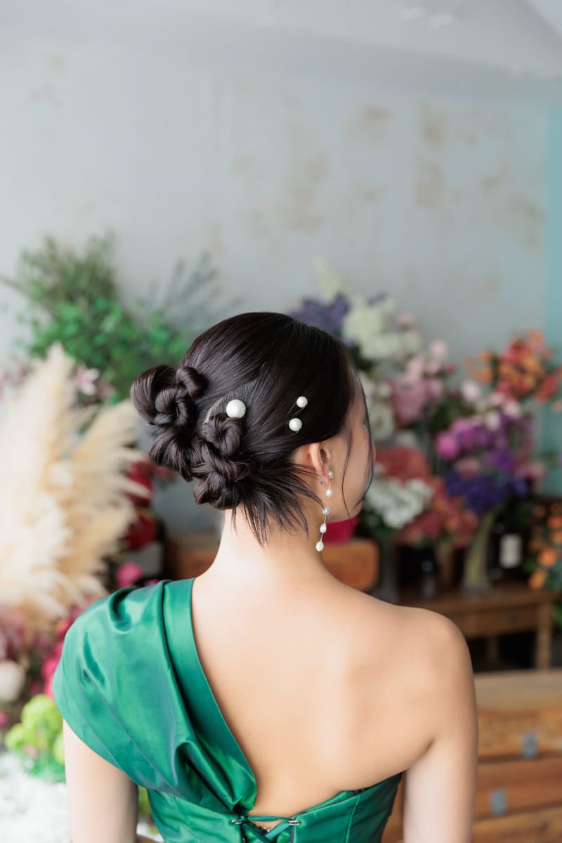メイクのポイントは和装の時と同様に艶感を意識しています!こちらのgreen dressはアイシャドウとチークの印象を変えてみました