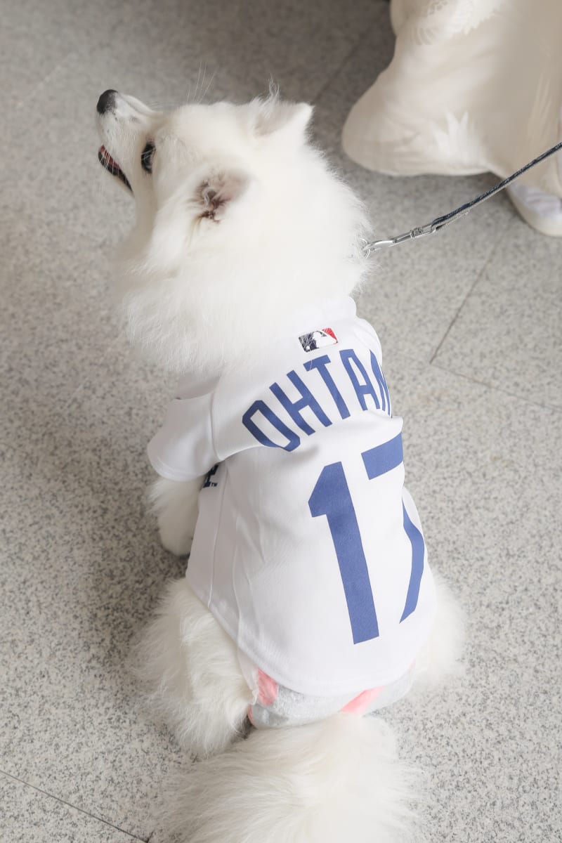 名前の由来となった選手のユニフォームを着て、ワンちゃんの気分はウキウキです!