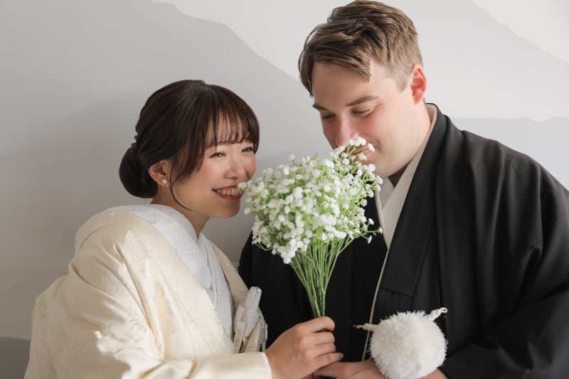お持ち込みいただいた霞草のブーケ。お二人で匂いを確かめていますね。
