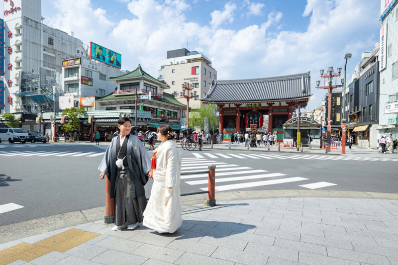 お二人は浅草らしさがある、雷門前で撮影をいたしました!