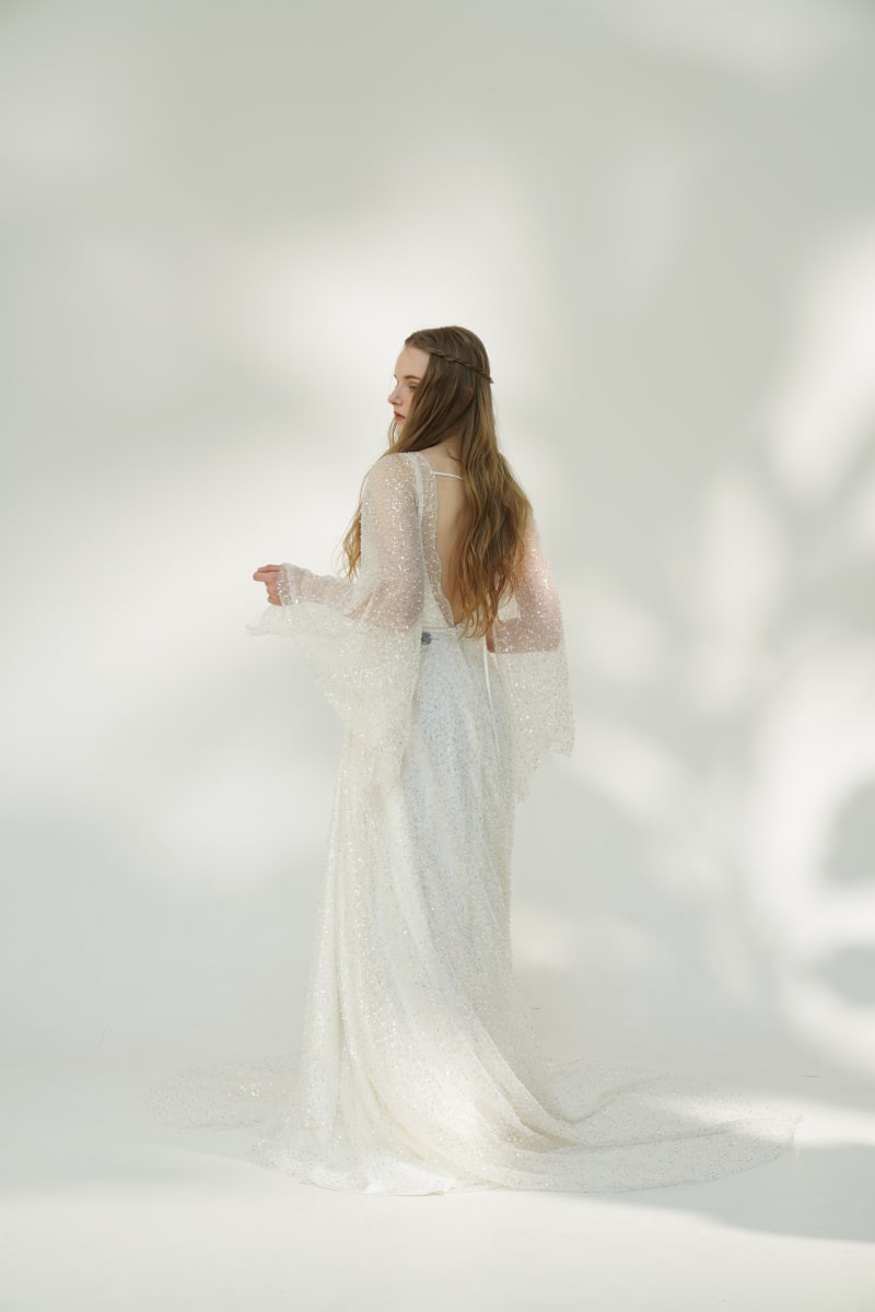 透け感の美しいロングスリーブと背中の開きが